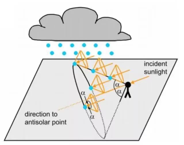 单个水滴是无法呈现整个彩虹的,当空气中有大量形状和密度较均匀的水滴时,在特定的角度这些水滴会向观察者发出较强的反射光,同一角度的水滴分布在一个假想的锥形上,而在观察者的眼中,就形成了彩虹。