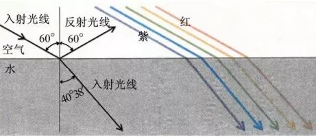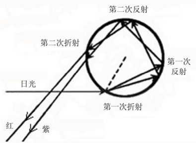 这样,阳光在小水滴中进行了两次折射和一次反射后,就被分解成红、橙、黄、绿、蓝、靛、紫七种单色光。