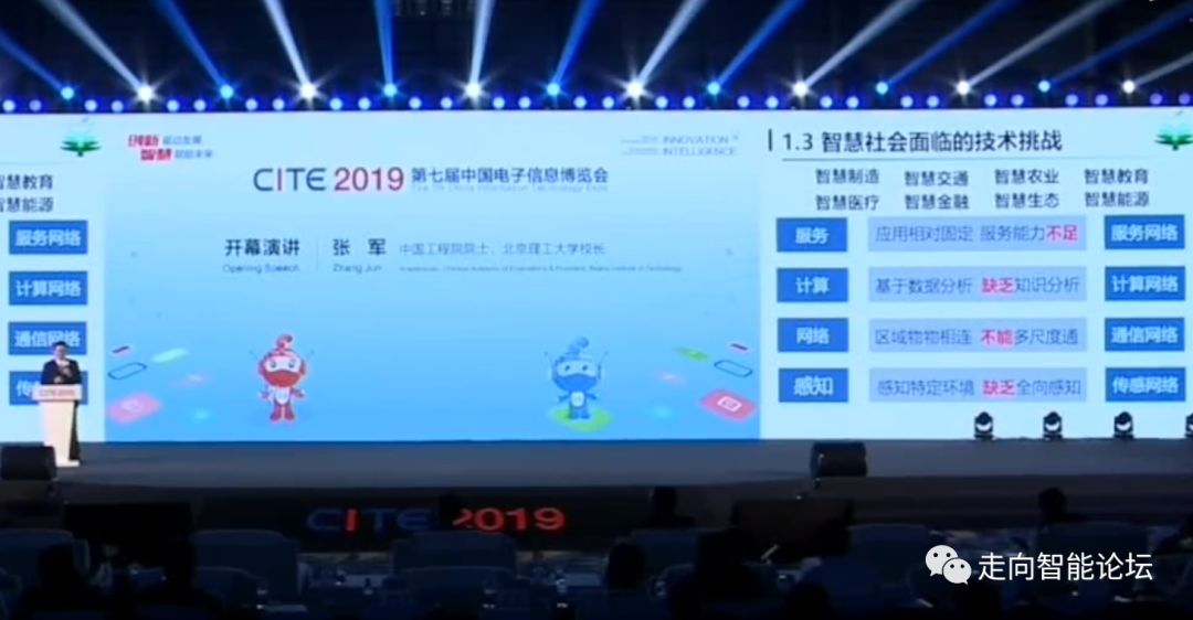 智慧社会现在面临哪些问题?我自己所在的领域是综合交通领域,从智慧交通来看,在感知特定环境中缺乏全方位的感知能力;在区域内的物物相连中没有多尺度的互通;在计算中多是基于数据分析,缺乏知识分析;服务应用相对固定,服务能力也存在不足,总结起来就是在感知、网络、计算和服务四个层面都存在一些问题。