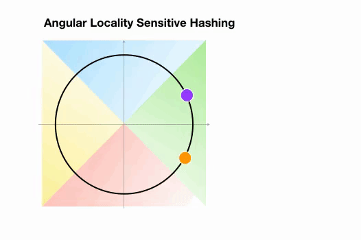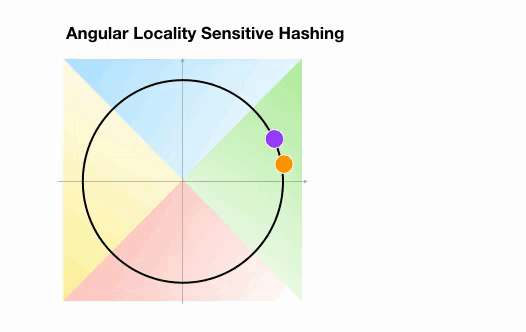 这里我们有两个点,它们投影到一个单位圆上,并随机旋转3次,角度不同。我们可以观察到,它们不太可能共享同一个hash桶。在下一个例子中,我们可以看到两个非常接近的点在3次随机循环后将共享相同的hash桶: