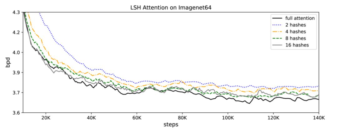 🎉LSH注意力匹配基准:📔注意LSH注意力是一个近似的全注意力,其准确性随着散列值的增加而提高。当哈希值为8时,LSH的注意力几乎等于完全注意力:
