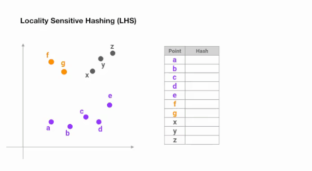 一旦我们找到所需长度的哈希码,我们就根据它们的哈希码将这些点分成桶 —— 在上面的例子中,a 和b属于同一个桶,因为hash(a) == hash(b)。现在,查找每个点的最近邻居的搜索空间大大减少了,从整个数据集到它所属的桶中。