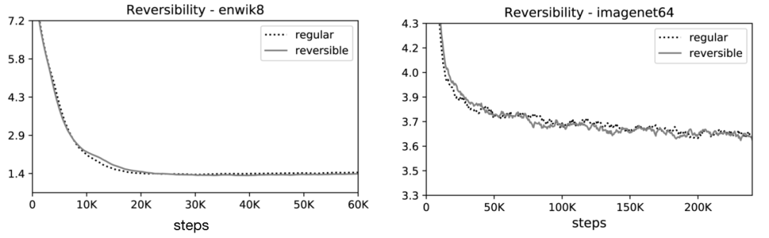🎉可逆Transformer匹配基准:他们的实验结果表明,可逆的Transformer 可以节省内存不牺牲精度:
