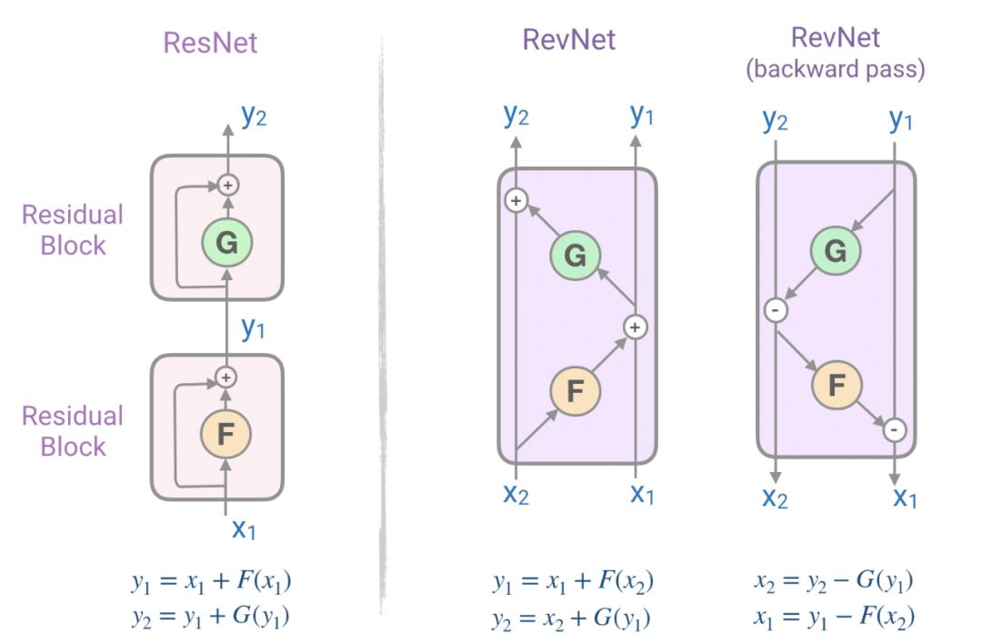 为了解决这个问题,由一系列可逆块组成的[可逆残差网络(RevNet)](https://papers.nips.cc/paper/6816reversib-resinetworkworkbackwithoutoutstorings -activations.pdf)。在Revnet中,每一层的激活都可以从后续层的激活中精确地重建,这使得我们可以在不将激活存储在内存的情况下执行反向传播。图6表示了残差块和可逆残差块。注意我们如何从它的输出(Y₁, Y₂)计算物体的输入(X₁, X₂)。