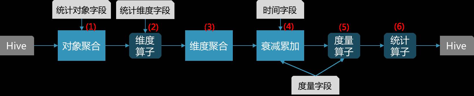 计算统计量。经过对象和维度聚合后,对象、维度、度量值建立了二级映射关系:对象维度度量值,相当于一个二维Map:Map<对象, Map<维度, 度量值>>。统计量是对Map<维度, 度量值>做一个聚合操作。每个统计量对应输出Hive表中的一个字段。现在主要支持如下几种算子: