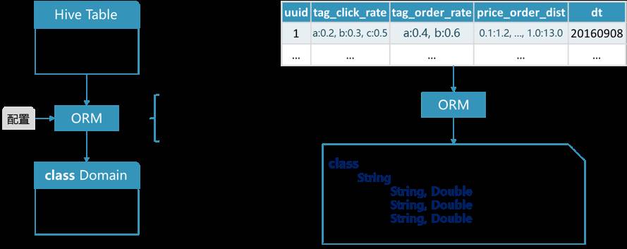 我们针对Hive开发了一套ORM库(见图8),主要基于Java反射,除了支持基本类型(int/long/float/double/String等),还支持POJO类型和集合类型(List/Map)。因为ETL不支持json拼接,为了兼容基于ETL统计的特征数据,我们的POJO以及集合类型是基于自定义的规范做编解码。针对Spark统计的特征数据,后续我们可以支持json格式的编解码。