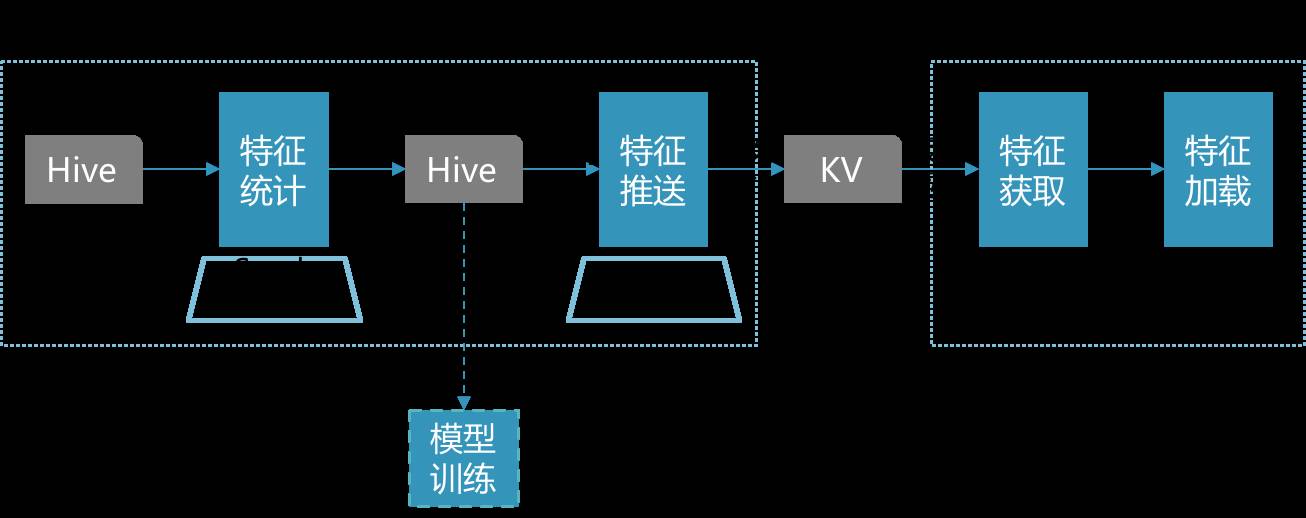 前两步为离线操作,后两步为在线操作。特征同步由离线推送和在线获取共同完成。离线生产流程是一个周期性的Pipeline,目前是以天为周期。
