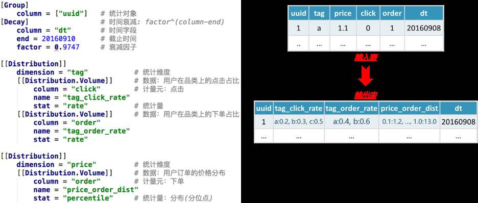 如下是统计用户点击品类偏好、用户下单品类偏好、用户下单额分布的配置文件和Hive表示例([Toml][1]格式)