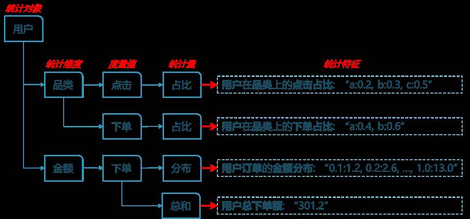 例如,对于用户点击品类偏好、用户下单品类偏好、用户下单额分布、用户下单总额等特征,可做范式分解: