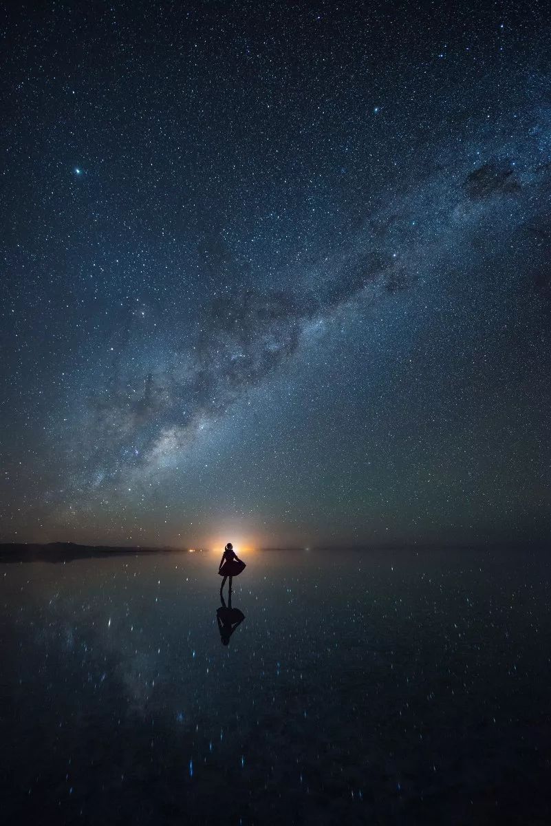 这张照片的设计非常巧妙。夜空的银河因为前景的舞者,而显得平衡不单调。舞者背后的灯光,很好的把人物从背景中分离了出来。水面上反射的点点星光,也让地面更加的丰富有趣。