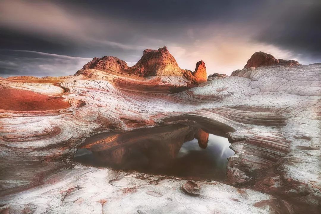 这幅作品拍摄于亚利桑那州荒野地区的Vermillion Cliff,这里的地貌十分有特色,暗红色的石头,纹理感非常好。在雪后拍摄,红白搭配,让人印象深刻。
