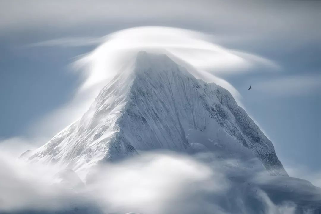 这张照片将壮阔的风景和飞鸟有力的结合。帽子云不仅非常难见,而且还在构图中起到了很好的框架作用,太让人惊叹了。