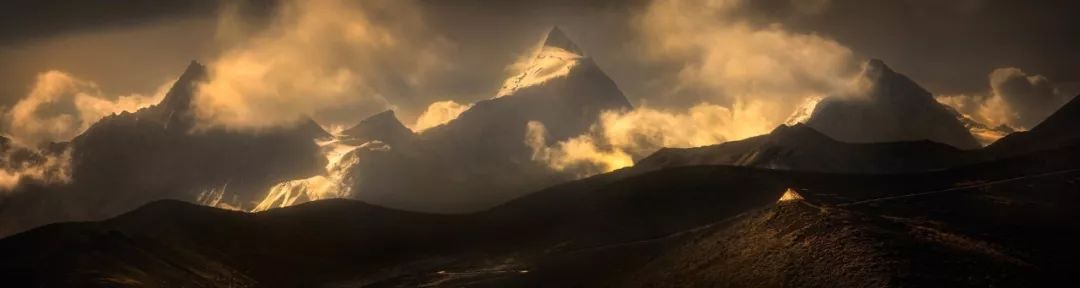 而另一个小三角形是前景中被阳光打亮的经幡,这也是构图的点睛之笔,通过大小对比,体现出雪山的雄伟,同时通过加入人文因素令整个画面生动起来。