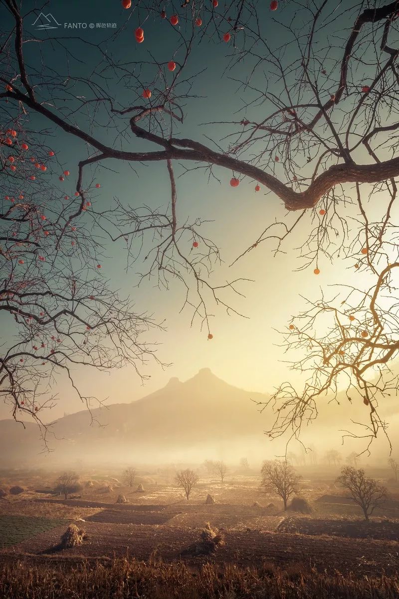 这张照片将清晨的田园风光表现的非常梦幻。近处的柿子树、中景的草垛和田野,带给我们关于环境的信息,而远景的云雾,和朦胧的山峰,则将氛围营造的很棒。画面冷暖色彩十分和谐,构图也非常有层次感。