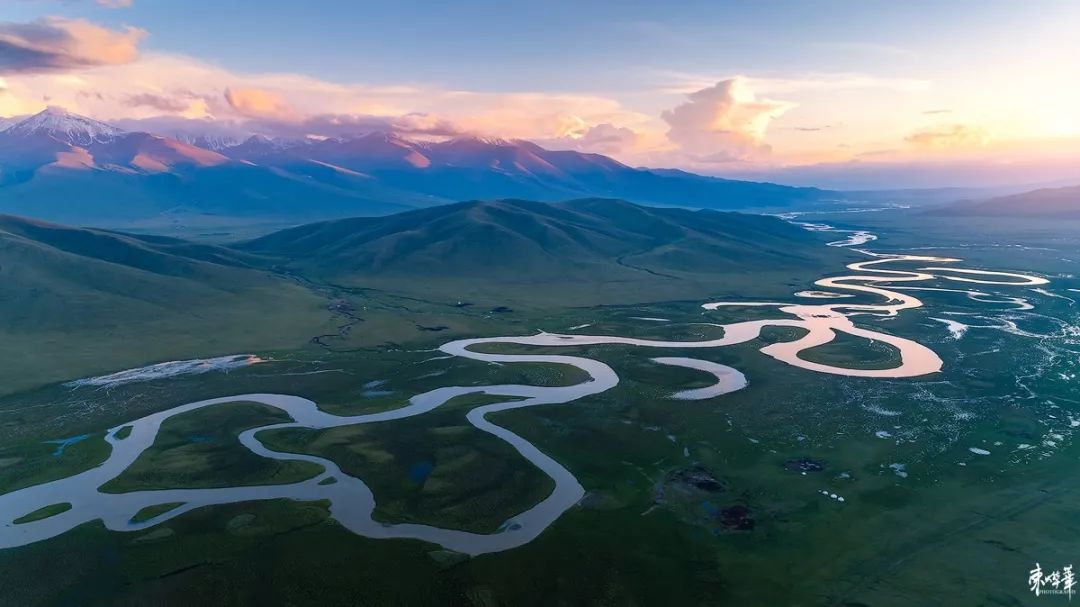 这张照片干净通透,色彩舒服。摄影师很好的利用了航拍的高角度优势,让弯曲的河流和连绵的雪山向远处展开,给我们带来了一幅精彩的画面。