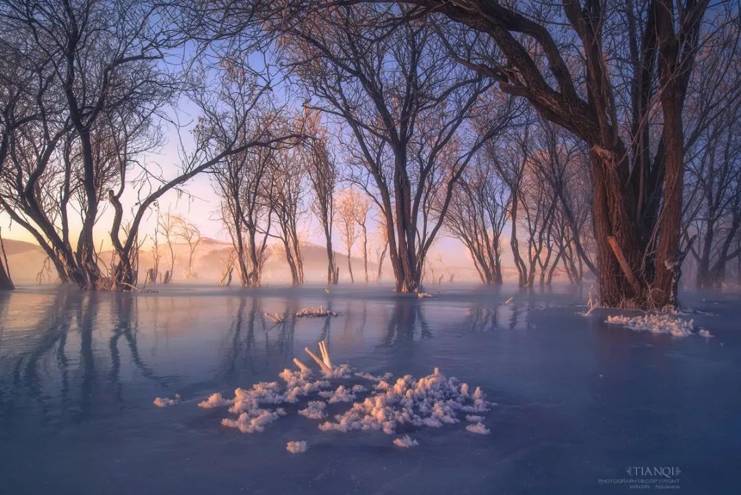 这张图片拍摄者利用了冰花和光线的点缀作为前景,同时左右两边较大的树木使拍摄者目光集中在画面中间,从前景逐渐往画面中间的倒影再到远处树林的观看。