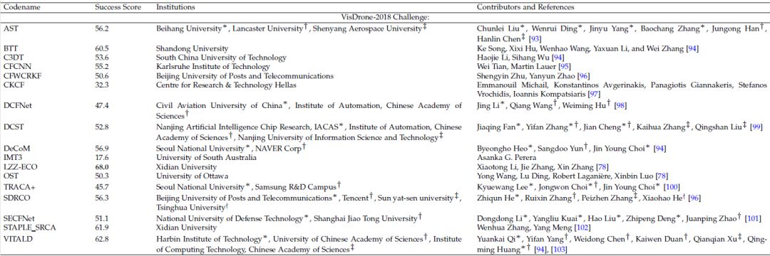 表6: 参加2018年和2019年VisDrone-SOT挑战赛的队伍,按字母顺序排列。