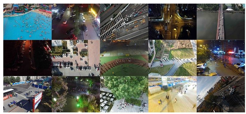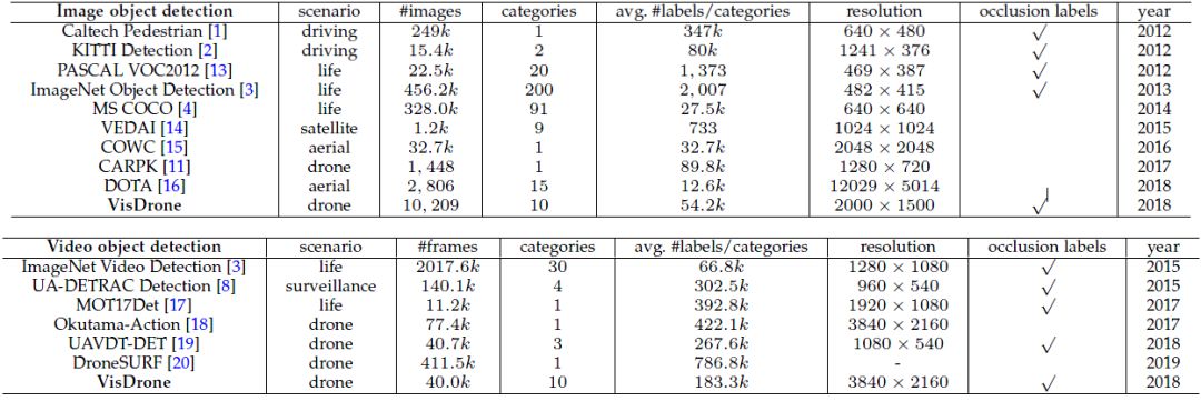 配备摄像头的无人机已经被快速部署到广泛的领域,包括农业、航空摄影、快速投递和监视。因此,对从这些无人机收集的视觉数据的自动理解变得非常困难,这将计算机视觉越来越紧密地带入了无人机。尽管一般的计算机视觉算法(如检测和跟踪)取得了很大的进步,但这些算法通常不是处理无人机捕获的序列或图像的最佳算法。这是由于各种各样的挑战,如较大的视点变化和规模。因此,为无人机捕获的视觉数据开发和评估新的视觉算法至关重要。然而,正如[10]和[11]所指出的,由于缺乏公开的大规模基准或数据集,对这一目标的研究受到严重限制。最近,[10]、[11]和[12]致力于构建无人机捕获的数据集,这些数据集主要用于目标检测或跟踪。由于数据收集和标注方面的困难,这些数据集的大小和涉及的场景仍然有限。对现有或新开发的算法进行彻底的评估仍然是一个开放的问题。为了进一步推进无人机平台视频分析研究,需要一个更通用、更全面的基准。
