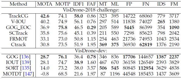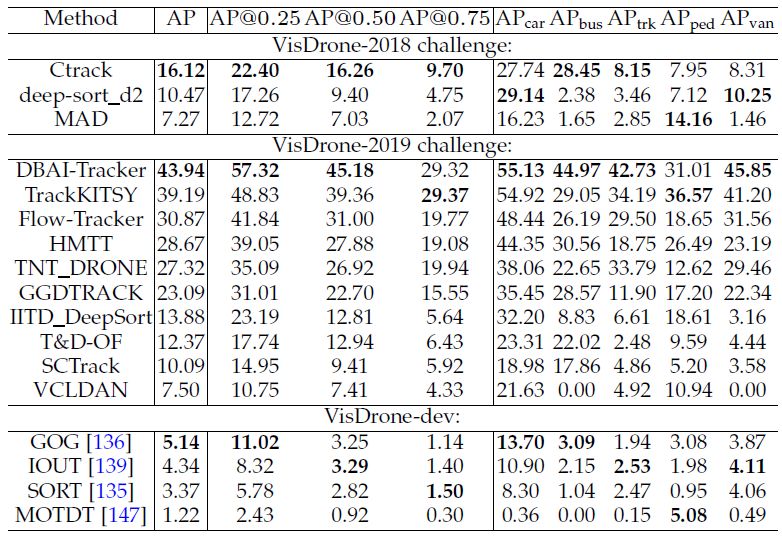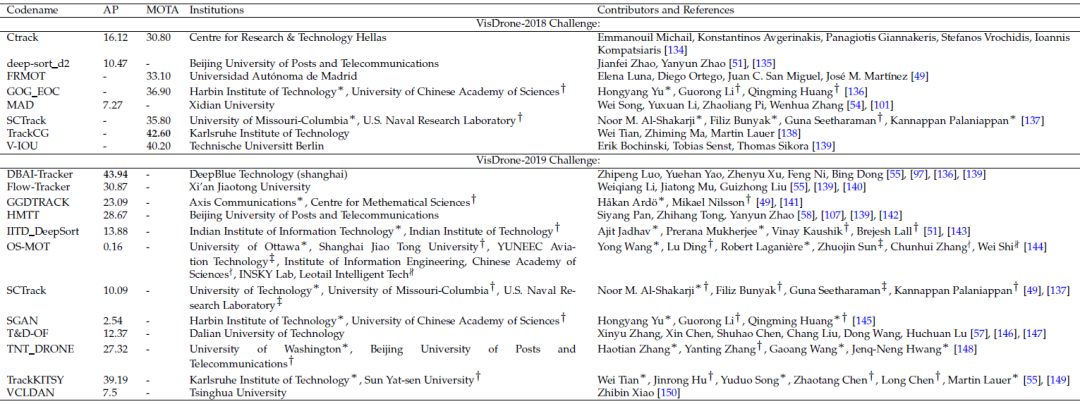 表7:参加VisDrone-MOT 2018和2019挑战赛的队伍,按字母顺序排列。