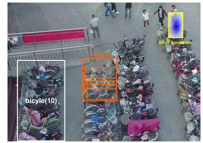图1: 提出的数据集的一些带注释的示例图像。虚线框表示目标被遮挡。不同的边框颜色指示目标的不同类别。为了更好地可视化,仅显示一些属性。