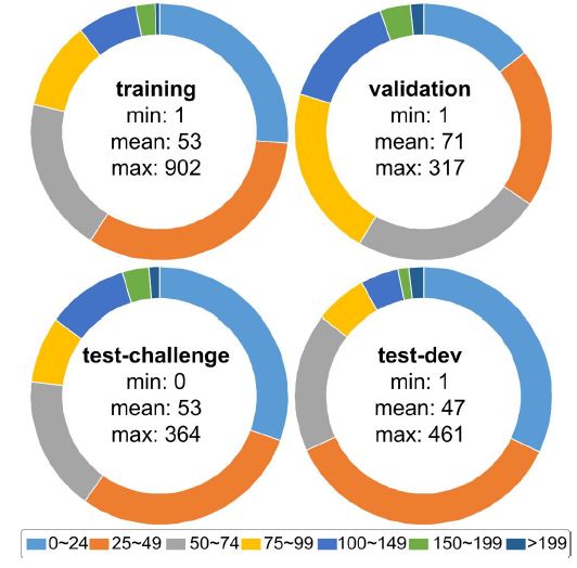 图2: 每幅图像的目标数量 vs. DET track中训练、验证、测试挑战和测试开发子集中图像的百分比。