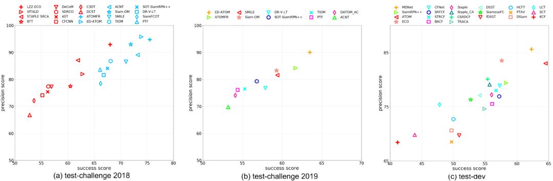 图8: (a)在2018年测试挑战赛中,VisDrone-SOT 2018(以红色标记表示)和VisDrone-SOT 2019(以蓝色标记表示)挑战中排名前10位的跟踪器的success vs. precision 得分。 VisDrone-SOT 2018和VisDrone-SOT 2019挑战中的跟踪器分别以红色和蓝色标记表示。 (b)在2019年测试挑战赛中,VisDrone-SOT 209挑战赛中排名前10位的跟踪器的success vs. precision 得分。(c)测试开发集上最先进的跟踪器的success vs. precision 得分。