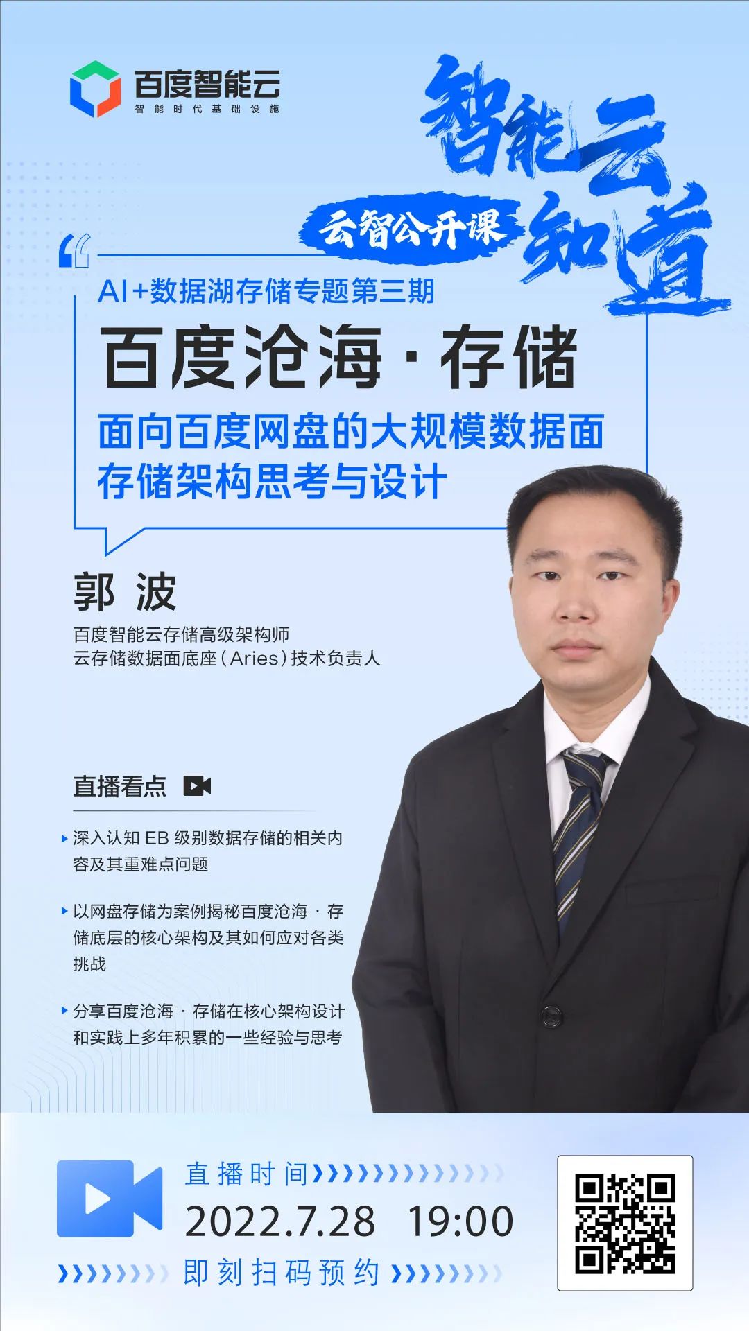 如百度网盘这样的大规模数据存储,具体挑战有哪些?如何应对解决?百度网盘在存储技术层面又是怎么做的?一切答案,尽在《面向百度网盘的大规模数据面存储架构思考与设计》线上公开课,百度智能云存储高级架构师 / 云存储数据面底座(Aries)技术负责人郭波将作为讲师,详解大规模数据面存储架构思考与设计,以及百度网盘的最佳实践。
