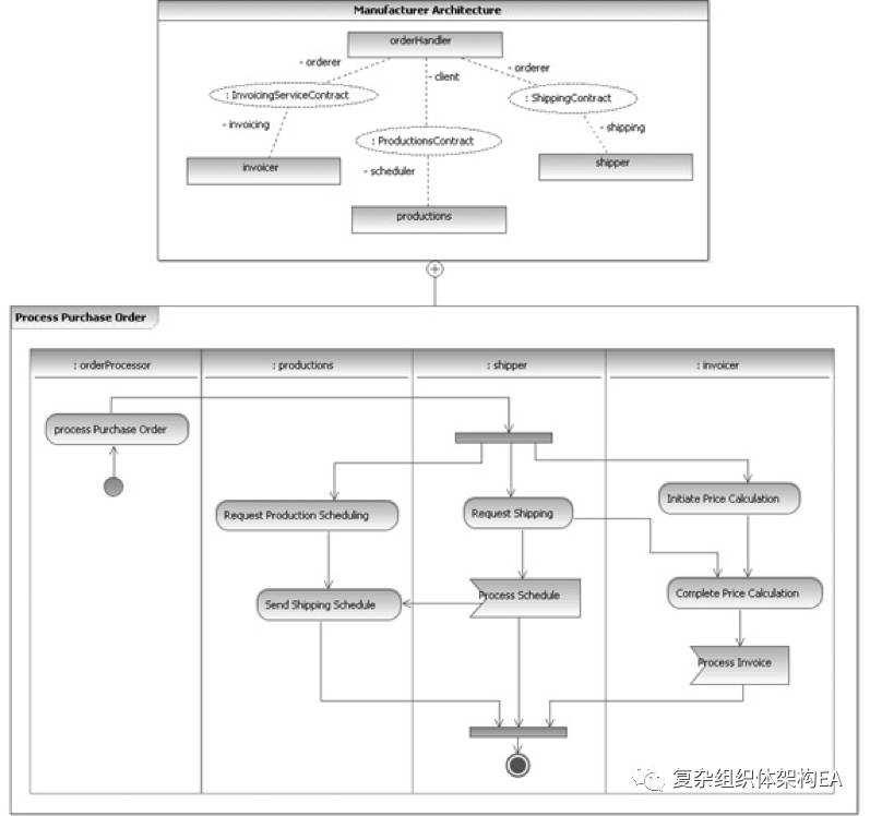 服务架构是使用标识符(一个分隔的矩形)显示的,而不是通常所用的 UML 协作省略号。UML 2 支持两种形式。该例使用矩形符号,因为对于角色它拥有更多的空间。