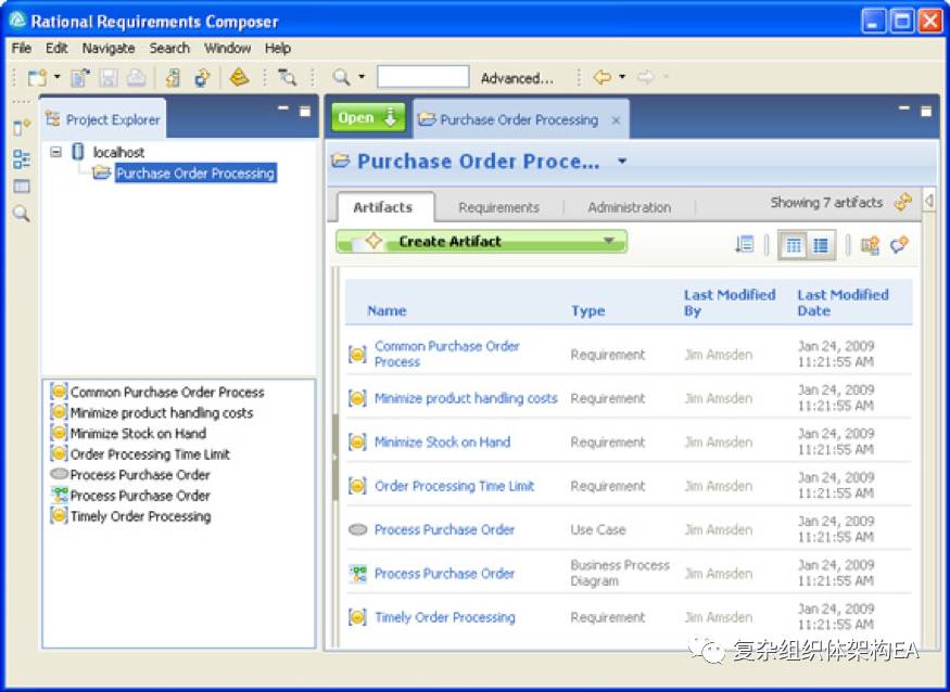 图 1 显示了 Rational RequirementsComposer 中获得的需求:注意要使 Process Purchase Order 业务用例能够满足所有的业务目标。