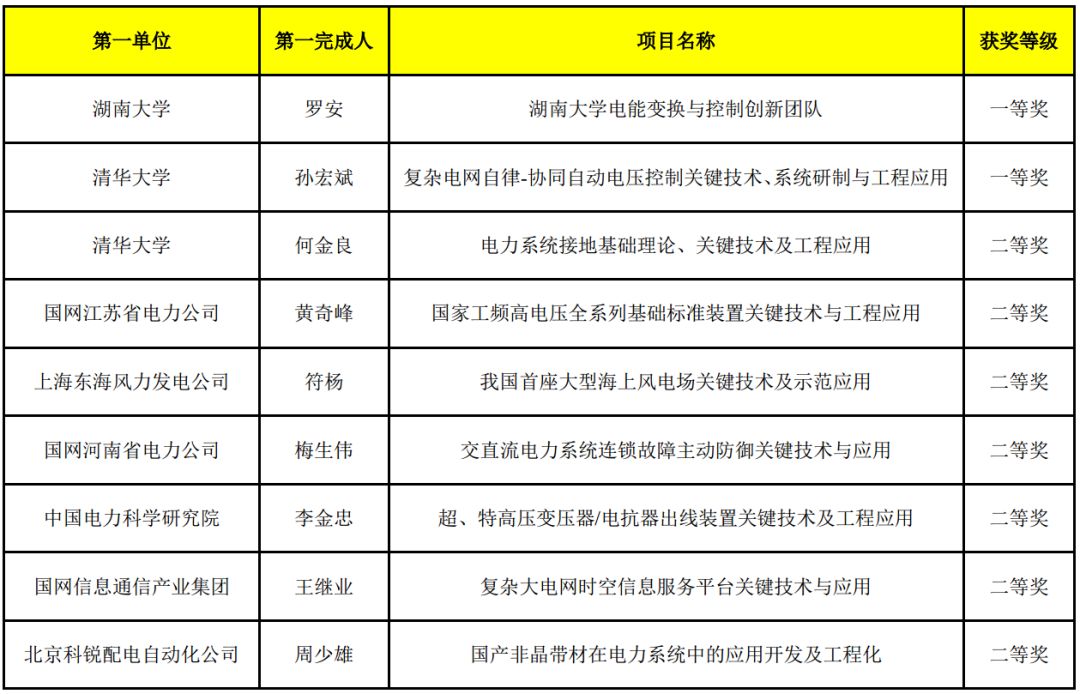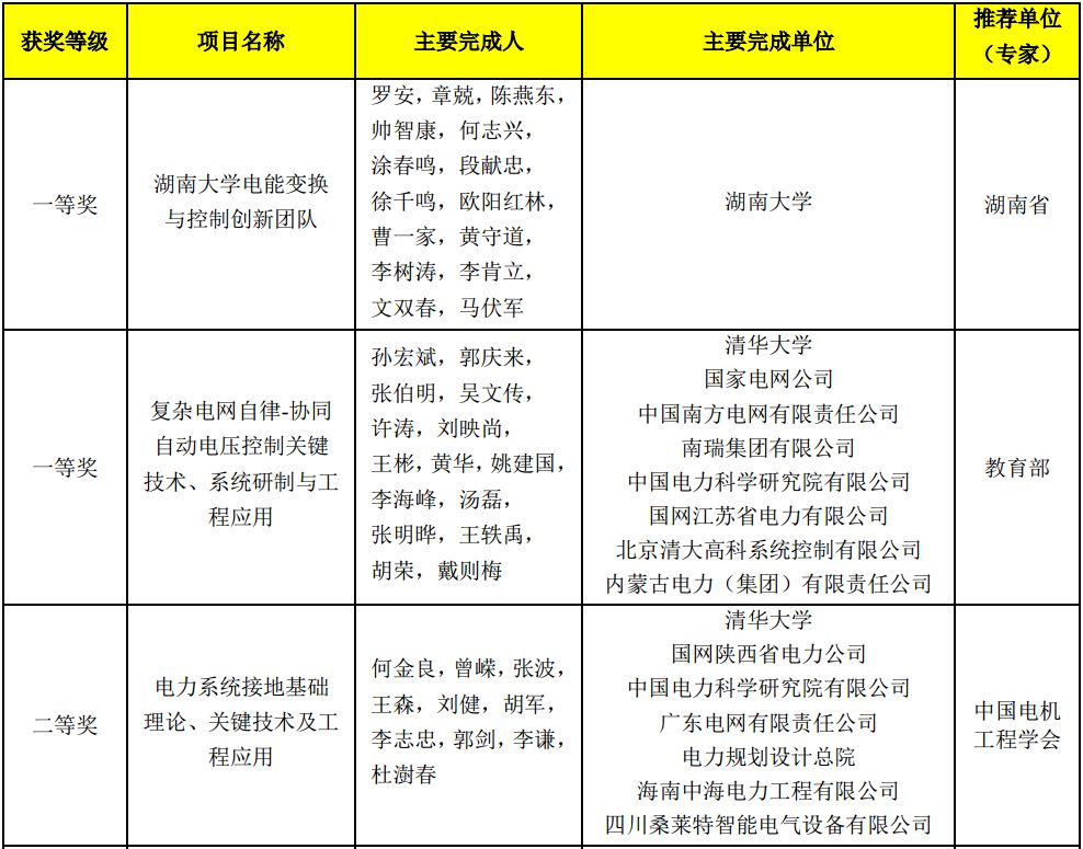 电气工程相关领域共斩获国家自然科学奖1项、国家技术发明奖3项、国家科技进步奖9项、创新团队一等奖1项。其中,中国工程院院士罗安教授领导的湖南大学电能变换与控制创新团队荣获国家科技进步奖——创新团队奖;清华大学孙宏斌教授牵头的《复杂电网自律-协同自动电压控制关键技术、系统研制与工程应用》项目荣获国家科技进步一等奖;这一成果曾入选中国高校十大科技进展;华中科技大学牵头完成的一项专用项目(内部公示)获国家科技进步二等奖。