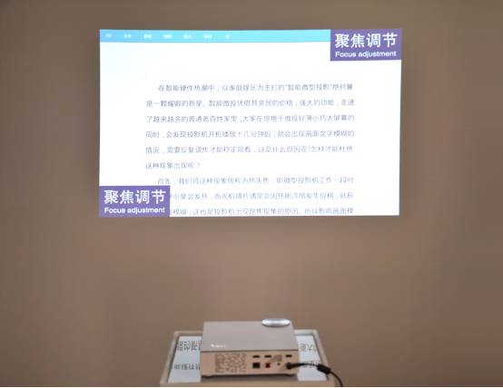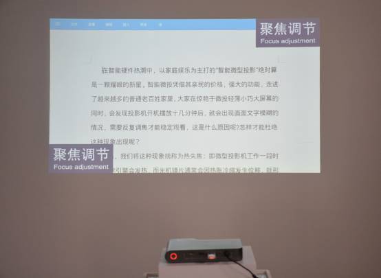 后面小编也测试了其他业内知名的大品牌包括台湾和日韩厂商的微投影产品,发现几乎都存在不同程度的“热失焦”现象,看来这还真是微投影行业的难题。不过,当小编测试某画的产品时,发现有所不同。某画目前在市场上主推的是两款TT和大威系列,刚开机几分钟也有要失焦的迹象。此时画面一闪,在屏幕的左下角和右上角出现了“聚焦调节”四个字,瞬间出现又消失,不注意几乎看不到,时间不超过2秒,此时画面重又恢复清晰了。