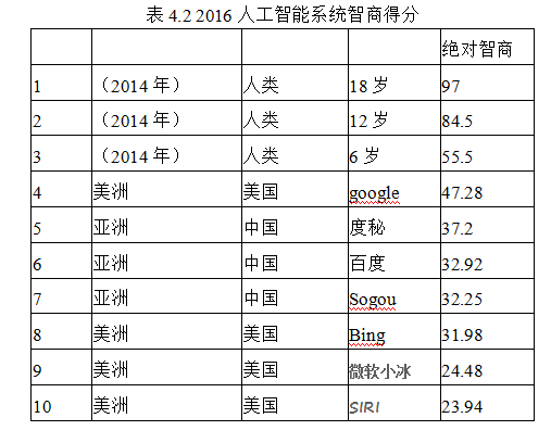 2016年2月,研究团队开展了“2016年人工智能系统的智商测试”,目前已对谷歌、百度、搜狗等人工智能系统以及苹果Siri、微软小冰等进行了测试,工作还在进行中。不过从已完成的工作看,谷歌、百度等人工智能系统的性能比两年前已有大幅提高,但仍与6岁儿童有一定差距。