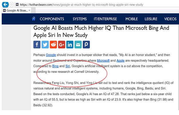 美国科技媒体HotHardware网站把研究成果的出处从“中国科学院虚拟经济与数据科学研究中心“ 错误的写成"美国康内尔大学”.作为颇有影响力的美国科技媒体,HotHardware出现这种错误实属不该。