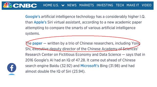 这项研究的真实出处是中国科学院虚拟经济与数据科学研究中心,由计算机博士,互联网进化论作者刘锋,中国科学院虚拟经济与数据科学研究中心主任石勇教授,中国科学院经济管理学院刘颖副教授组成的研究团队完成,题目是“人工智能的智商评测与智能等级研究”(Intelligence Quotient and Intelligence Grade of Artificial Intelligence),研究论文发表在2017年Annals of Data Science期刊上。