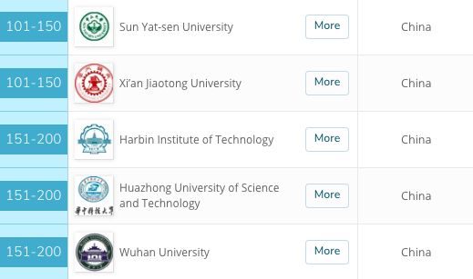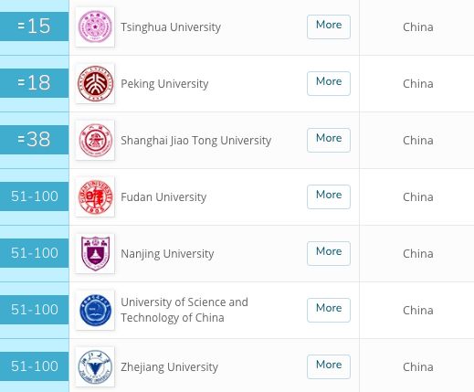 除了清华北大外,进入前100名的还有:复旦大学(40名)、浙江大学(54名)、上海交通大学(60名)、中国科技大学(89名)。南京大学位列第120名,进入前200。