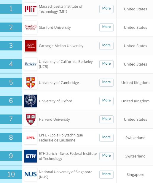 第二和第三名是斯坦福大学、CMU。四到十名分别是:加州大学伯克利分校、剑桥大学、牛津大学、哈佛大学、洛桑联邦理工学院(去年并列第18名)、苏黎世联邦理工学院、新加坡国立大学。