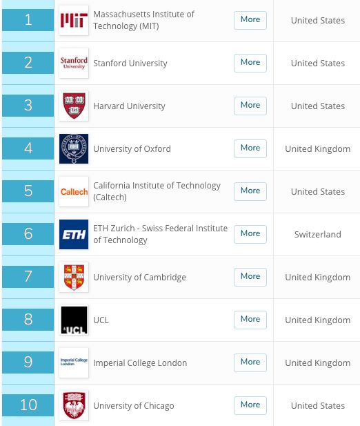 MIT、斯坦福大学、哈佛大学、牛津大学、加州理工学院、苏黎世联邦理工学院、剑桥大学、伦敦大学学院(UCL)、帝国理工学院(Imperial College London)、芝加哥大学。