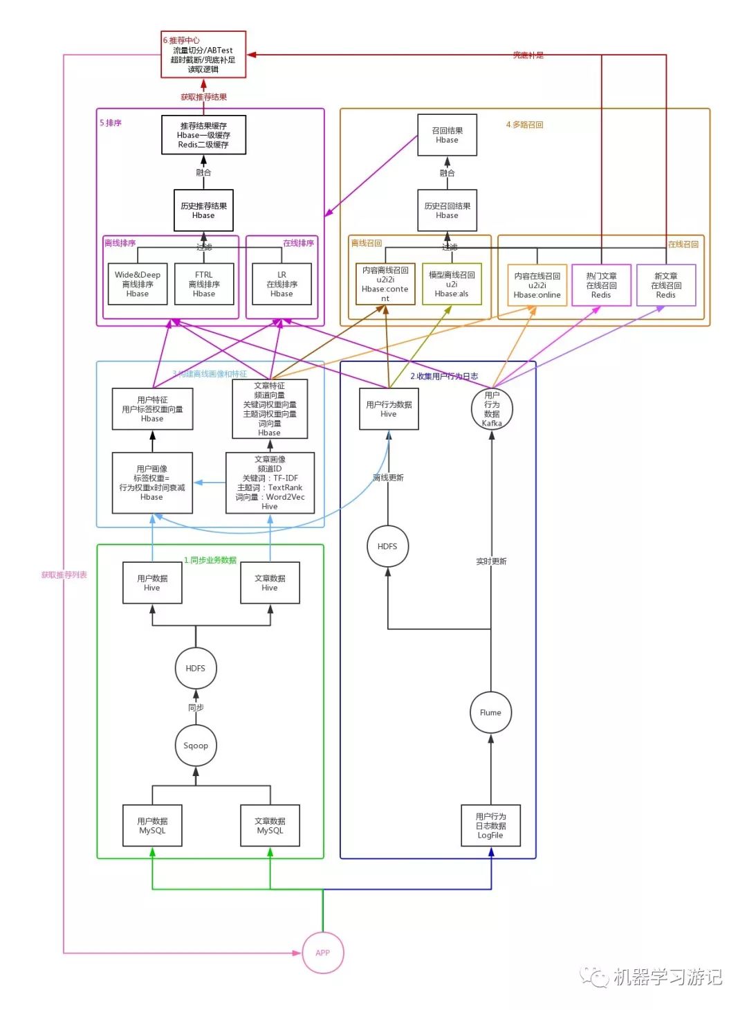 这里以文章推荐系统为例,讲述一下推荐系统的完整流程,如下图所示: