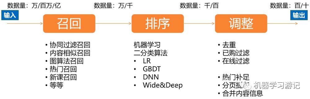 为了解决如上这些问题,推荐系统通常被设计为三个阶段:召回、排序和调整,如下图所示: