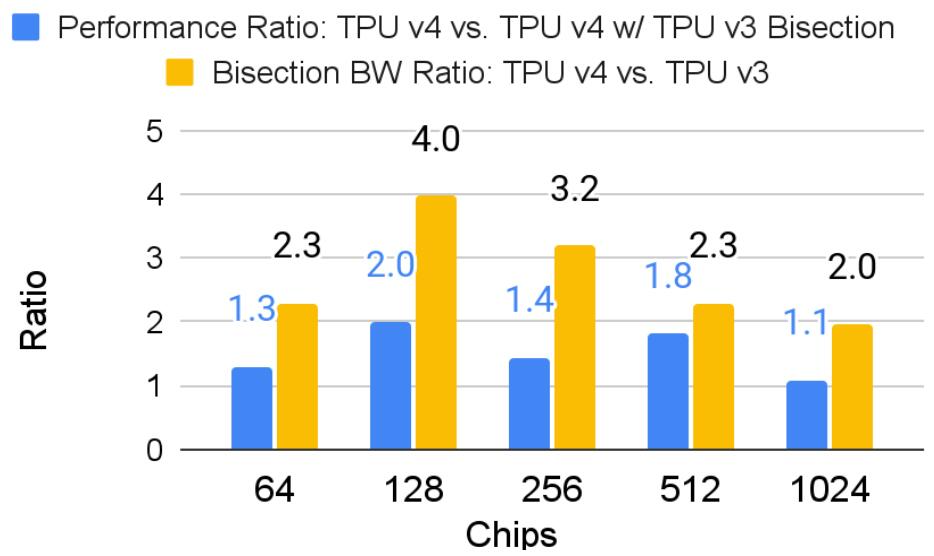 在特定芯片数量下,TPU v3/v4 对分带宽比高 2-4 倍,嵌入速度可以提高 1.1-2.0 倍。