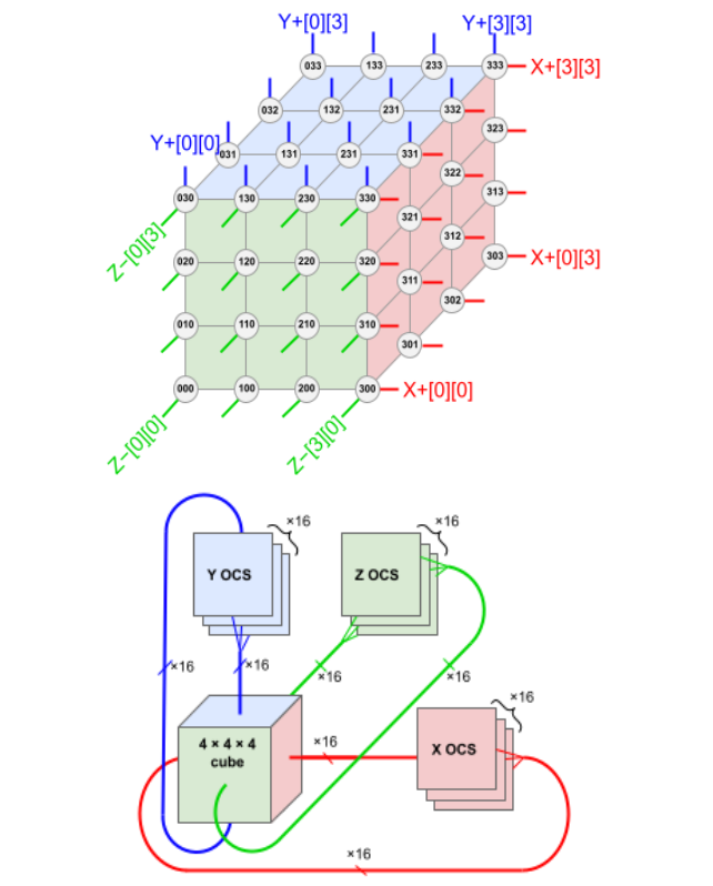 根据这样的排布,TPU v4(中间的 ASIC 加上 4 个 HBM 堆栈)和带有 4 个液冷封装的印刷电路板 (PCB)。该板的前面板有 4 个顶部 PCIe 连接器和 16 个底部 OSFP 连接器,用于托盘间 ICI 链接。