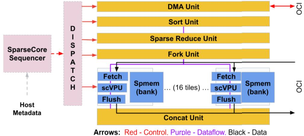 最通用的 SC 单元是 16 个计算块(深蓝色框)。每个 tile 都有一个关联的 HBM 通道,并支持多个未完成的内存访问。每个 tile 都有一个 Fetch Unit、一个可编程的 8-wide SIMD Vector Processing Unit 和一个 Flush Unit。获取单元将 HBM 中的激活和参数读取到 2.5 MiB 稀疏向量内存 (Spmem) 的图块切片中。scVPU 使用与 TC 的 VPU 相同的 ALU。Flush Unit 在向后传递期间将更新的参数写入 HBM。此外,五个跨通道单元(金色框)执行特定的嵌入操作,正如它们的名称所解释的那样。