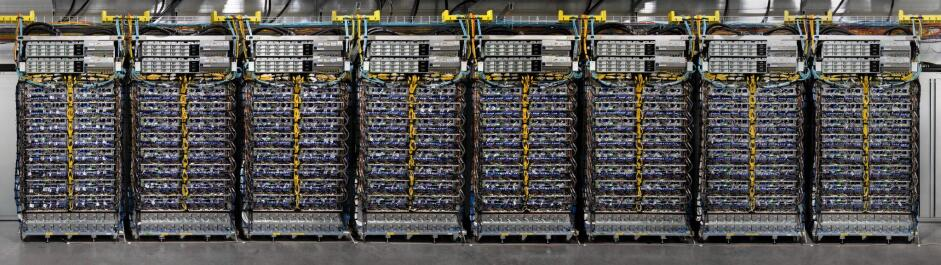 随后,八个 64 芯片机架构成一台 4096 芯片超算。