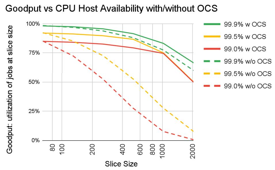 与超级计算机一样,工作负载由不同规模的算力承担,称为切片:64 芯片、128 芯片、256 芯片等。下图显示了当主机可用性从 99.0% 到 99.9% 不等有,及没有 OCS 时切片大小的「有效输出」。如果没有 OCS,主机可用性必须达到 99.9% 才能提供合理的切片吞吐量。对于大多数切片大小,OCS 也有 99.0% 和 99.5% 的良好输出。