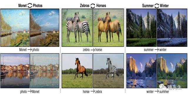 Zhu等[29]提出了CycleGAN,在不存在成对训练样本的情况下,学习将源领域图像转换成目标领域图像。GAN通常只有一个生成器和一个判别器,CycleGAN却有两个生成器和两个判别器。一个生成器(用G表示)将X域的图像转换成Y域的图像,另一个生成器(用F表示)将Y域的图像转换成X域的图像。两个判别器DY和DX试图分辨两个域的真伪图像。由于在结构上施加了循环一致性约束,CycleGAN可双向转换不丢失信息,转换后的图像不但真实,而且包含原图像的信息,避免了模式塌陷问题。CycleGAN是一种通用方法,可以应用到许多图像到图像转换任务中,包括风格迁移、目标变形、季节转换、照片增强等。图9显示了CycleGAN的实验效果。