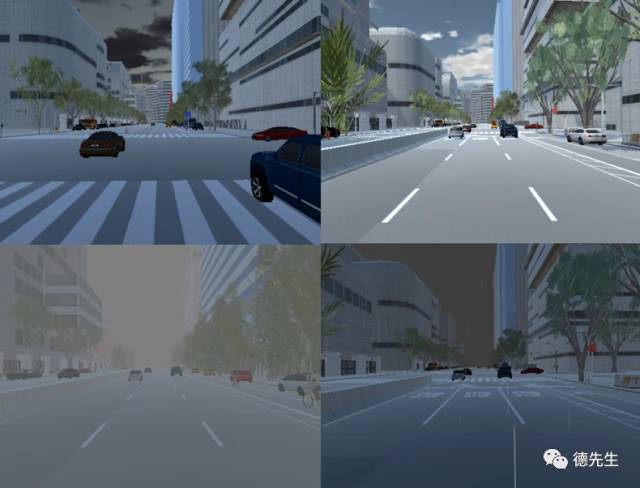 (左上:阴天;右上:晴天;左下:雾天;右下:雨天。)