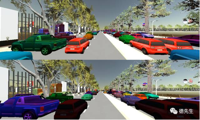 图4 在相邻图像帧中,渲染改变道路上车辆的颜色