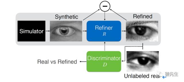 利用计算机合成图像来训练视觉模型,能够避免昂贵的图像标注过程。但是,合成图像与真实图像之间存在分布差距,直接利用合成图像来训练模型,难以获得满意的性能。为了缩小合成图像与真实图像之间的分布差距,苹果公司的Shrivastava等[28]提出了SimGAN,提出一种模拟+无监督学习方法,利用未标记真实图像来提高合成图像的逼真性,同时保持合成图像的标注信息(例如眼球的注视方向)。图8显示了SimGAN的结构,合成图像经过Refiner神经网络R处理,得到改进后的图像,判别器D用于区分图像是真实图像还是改进后的图像。Refiner网络R和判别器D交替更新。