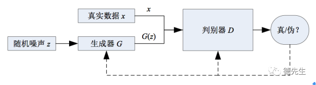 pdata的样本。如果判别器的输入来自真实数据,标注为1。如果输入样本为G(z),标注为0。这里D的目标是实现对数据来源的二分类判别:真(来源于真实数据x的分布)或伪(来源于生成器的伪数据G(z)),而G的目标是使自己生成的伪数据G(z)在D上的表现D(G(z))和真实数据x在D上的表现D(x)一致。这两个相互对抗并迭代优化的过程使得D和G的性能不断提升,当最终D的判别能力提升到一定程度,并且无法正确判别数据来源时,可以认为生成器G已经学到了真实数据的分布。