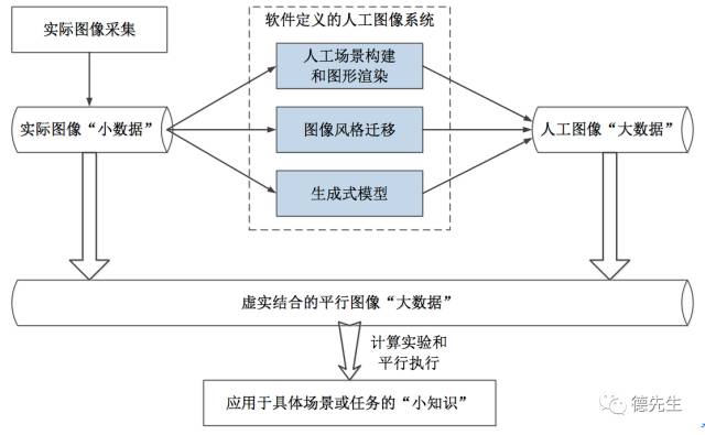 图2显示了平行图像的技术流程。从实际场景中采集得到实际图像“小数据”,输入软件定义的人工图像系统,通过解析和吸纳实际图像的特点,自动生成大量新的人工图像数据。这些人工图像数据和实际图像“小数据”一起构成虚实结合的平行图像“大数据”,在此基础上进行平行视觉的计算实验和平行执行,通过学习提取得到应用于某些具体场景或任务的“小知识”。这里的“小”是针对所需解决具体问题的特定智能化的知识,而不是指知识体量上的小。图2虚线方框内显示了平行图像的核心单元,即软件定义的人工图像系统。人工图像系统的实现方法包括图形渲染、图像风格迁移、生成式模型等。